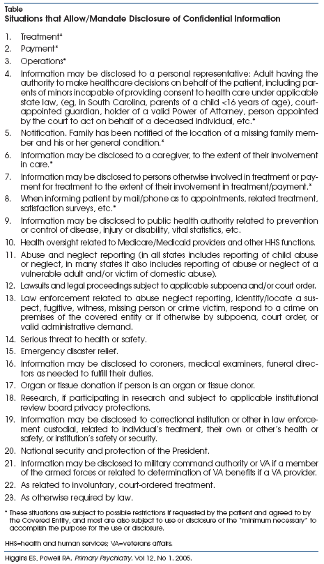 exception of treatment (Table) would allow limited disclosure of confidential