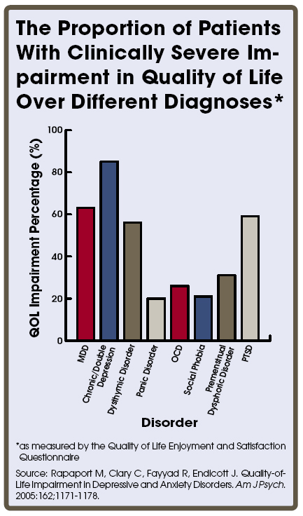 The picture is further complicated because, Dr. Rapaport believes, clinicians do not always appreciate how a person’s perception of his or her own quality of life can be drastically discordant with how well he or she functions on a day-to-day basis. It is one of the reasons why there can be a disconnection between objective measures of functioning and patients’ perceptions of what their lives are like. In these cases, an assessment of objective functioning is essential. Social phobias, for instance, often have very early onset, and as a result, those who suffer from them might perceive their quality of life as significantly higher than a more objective, experienced observer.