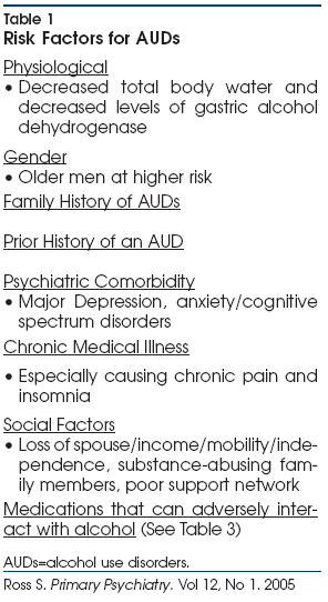 Some experts on AUDs in the elderly employ the model of “risky” and “problem” alcohol use instead of the >DSM-IV model of alcohol abuse and dependence,