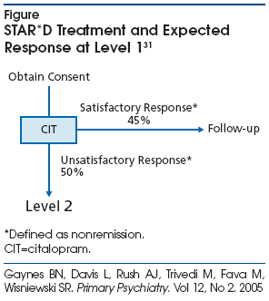 The design of the STAR*D was guided by a number of key considerations. First, the aim of treatment for depression is full remission of symptoms—not merely achieving a response with residual symptoms, which are associated with a substantially higher risk of recurrent depressive illness. 26 Second, less than half of depressions will remit when treated with 8–12 weeks of antidepressant medication or psychotherapy. Third, a reported history of treatment response is difficult to confirm because of questions about the accuracy of self-report information and the difficulty confirming whether prior trials were adequate in dose and duration. Fourth, many treatment options are available, but it is not clear which course to pursue after a previous treatment has failed. Finally, results must be generalizable to the majority of patients seen in actual practice, ie, patients seen in psychiatric and primary care settings with medical and psychiatric comorbidities.