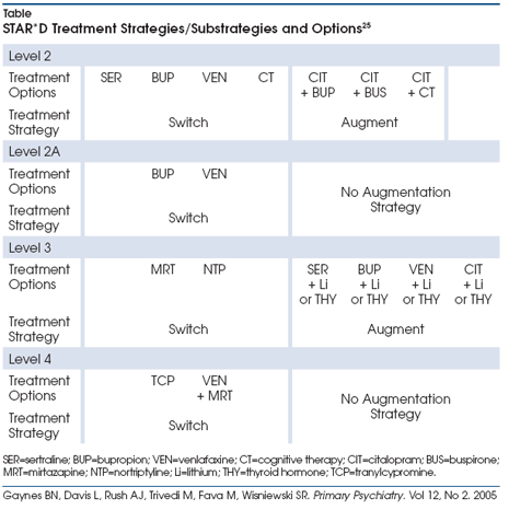 25. Rush A, Fava M, Wisniewski S, et al. Sequenced Treatment Alternatives to Relieve Depression (STAR*D): Rationale and Design. Control Clin Trials. 2004;25(1):119-142.