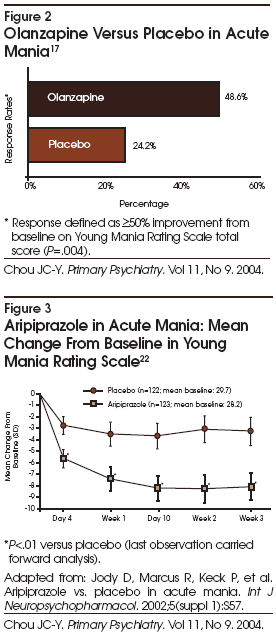 18. Tohen M, Jacobs TG, Grundy SL, et al, for the Olanzapine HGGW Study Group. Efficacy of olanzapine in acute bipolar mania: a double-blind, placebo-controlled study. Arch Gen Psychiatry. 2000;57(9):841-849.