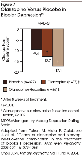 Since the guideline was published, a new pivotal study (Figure 7)20 has led to the first FDA approval for a treatment for acute bipolar depression, a combination of olanzapine and fluoxetine. This study, with over 700 randomized subjects, showed that both olanzapine and an olanzapine/fluoxetine combination have acute antidepressant efficacy in bipolar depression.20 Olanzapine alone was statistically superior to placebo in acute efficacy but had a relatively small clinical effect. More interestingly, a combination of olanzapine and fluoxetine was superior to both placebo and olanzapine monotherapy. The average dose of olanzapine was 9.7 mg/day. The average doses of olanzapine and fluoxetine in combination were 7.4 mg/day and 39.3 mg/day, respectively. Neither active treatment caused more switching into mania than placebo.20