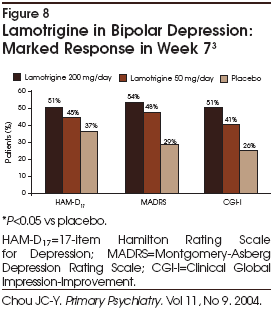 Other research in this area includes an acute bipolar I depression trial of lamotrigine (Figure 8), which demonstrated clinically significant antidepressant efficacy and an overall mania switch rate equal to placebo.3 This study led to the inclusion of lamotrigine as a first-line treatment in the guideline. The onset of efficacy was seen by 3 weeks, although at that point the lamotrigine dose was only 50 mg/day; response increased further with subsequently increased doses up to 200 mg/day. This trial provides evidence of antidepressant efficacy in bipolar depression and suggests that lamotrigine could be considered as a first-line treatment. Furthermore, although lamotrigine must be titrated slowly to reduce the risk of serious rash, the statistically significant separation from placebo by 3 weeks of treatment, even at a dose of only 50 mg/day, indicates that the antidepressant response to lamotrigine may be no slower than that of antidepressants. Unfortunately, there is no evidence of efficacy in acute mania.