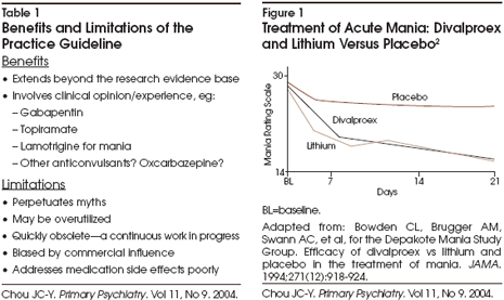 The American Psychiatric Association’s “Practice Guideline for the Treatment of Patients with Bipolar Disorder” represents a major synthesis of the available research and expert clinical opinion on bipolar disorder. The guideline extends beyond the clinical research evidence base and bridges the highly-controlled conditions of clinical trials and the broader range of clinical situations encountered in practice. However, any practice guideline is inevitably outdated by the time it is published, due to the time required in the process of its creation and publication. This article summarizes the recommendations in the APA bipolar practice guideline and reviews new relevant research available since its publication. The concept of a “mood stabilizer,” which is not incorporated in the guideline, is reviewed. In addition, the numerous clinical assumptions underlying the recommendations in the guideline are described, and the strength of the research evidence supporting them is reviewed. These include the assumptions that lithium and anticonvulsants are preferred treatments while antipsychotics and benzodiazepines are not, that nonresponding patients should always have additional medication added rather than switching to a new medication, that all antidepressants have a significant liability for causing switching into mania, and that all bipolar patients should receive long-term maintenance. New research with lamotrigine, olanzapine, and other atypical antipsychotics in bipolar disorder is reviewed, as well as the implications of this research on the recommendations in the guideline. The concept of directional efficacy of mood stabilizers, only briefly mentioned in the guideline, is discussed and expanded. Finally, the importance of understanding the research basis of the guideline before applying its recommendations to clinical practice is described.