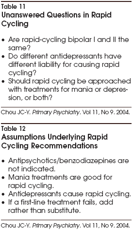 The practice guideline recommendations for treatment of rapid cycling (Table 10)1 are based on a very small and incomplete research database (Table 11). The majority of the literature on treatments for rapid cycling is either in the form of case series or retrospective analyses and only clearly shows that rapid cycling is associated with poor response to lithium and also possibly carbamazepine. Hence, the assumptions that are made elsewhere in the practice guideline reappear in the rapid-cycling section (Table 12). For example, while efficacious mania treatments including lithium and valproate are recommended, atypical antipsychotics and benzodiazepines are omitted despite their documented efficacy in mania. The widely accepted notion that antidepressant use is associated with rapid cycling has been consistently documented in retrospective analyses of current rapid-cycling patients42,43 but has never been tested in a prospective trial (Table 13).42,44-56 The concept of adding rather than substituting, which was discussed earlier, is repeated in this section of the guideline.