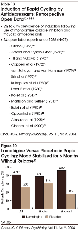 57. Calabrese JR, Suppes T, Bowden CL, et al, for the Lamictal 614 Study Group. A double-blind, placebo-controlled, prophylaxis study of lamotrigine in rapid-cycling bipolar disorder. J Clin Psychiatry. 2000;61(11):841-850.