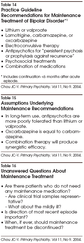 Lithium, carbamazepine, divalproex, lamotrigine, and olanzapine all have some placebo-controlled evidence of maintenance efficacy (Table 14). However, there is limited data available allowing direct comparisons of the efficacy of these medications in bipolar maintenance (Tables 15 and 16). Therefore, treatment choices are typically made based on tolerability and continuing the medication that worked in the acute episode.