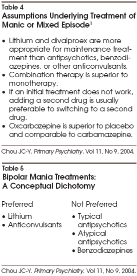 There are many assumptions regarding treatment of manic or mixed episode that underlie these recommendations (Table 4).1 While these assumptions may reflect standard clinical care, the rationale behind them is based on limited research. The first assumption is that lithium and divalproex are appropriate for both acute and maintenance treatment, while antipsychotics and benzodiazepines are not. Supporting this is the fact that substantially more clinical and research trials with lithium and divalproex in bipolar maintenance have been performed. Although the guideline avoids calling such medications mood stabilizers, the authors clearly consider lithium and divalproex mood stabilizers, but do not consider other antipsychotics or benzodiazepines as such (Table 5).