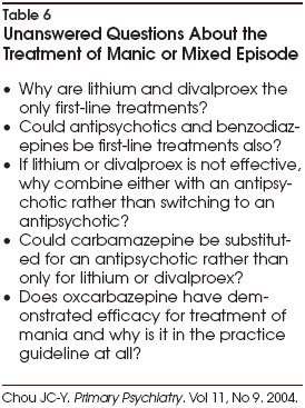 Bipolar disorder is a complex disorder often requiring a complex treatment plan. The APA practice guideline has summarized the research literature and expanded its conclusions on the basis of standard clinical practice. However, the guideline makes assumptions that have limited supporting evidence, including: atypical antipsychotics are more poorly tolerated than lithium or divalproex; combining a new treatment with one that is not working is preferable to switching to a new treatment; oxcarbazepine works as well as carbamazepine; all antidepressants cause mania; and adding lithium to an antidepressant will reduce chances of switching.