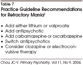 The same concerns described above for mania or mixed episode also apply to the refractory mania recommendations. The guideline recommends lithium, divalproex, or an antipsychotic for refractory patients, followed by carbamazepine and oxcarbazepine, as well as clozapine or ECT (Table 7).1 Again, the question of the definition of an adequate trial of monotherapy for mania is avoided. It is notable that neither lithium nor divalproex was shown to have efficacy in treatment of a manic episode in <7 days,2 suggesting that >1 week may be necessary to define nonresponse. The guideline for refractory mania does not clearly define the condition itself. Should clinicians wait for 7–10 days before considering a patient refractory? If this decision is made sooner, has lithium or divalproex been given a reasonable opportunity to work? What blood level of lithium or valproate should be achieved before a patient is considered refractory? Should the same duration criteria be used for atypical antipsychotics that appear to have more rapid onset of efficacy?25
