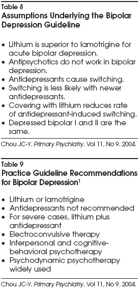 The early research basis of treatments for bipolar depression has been thoroughly reviewed by Zornberg and Pope.40 Many problems have limited the interpretability of these earlier studies, though, including the use of both unipolar and bipolar depressed subjects in early lithium trials; slow antidepressant response to either antidepressants or lithium in bipolar depression; and low overall rates of response. The guideline makes several assumptions about bipolar depression treatment (Table 8). The practice guideline recommends lithium or lamotrigine as first-line treatments, although it places a higher level of confidence in lithium, followed by a combination of an antidepressant with lithium or electroconvulsive therapy. In addition, interpersonal and cognitive-behavioral psychotherapies are suggested, although the limited evidence of their efficacy is acknowledged (Table 9).1