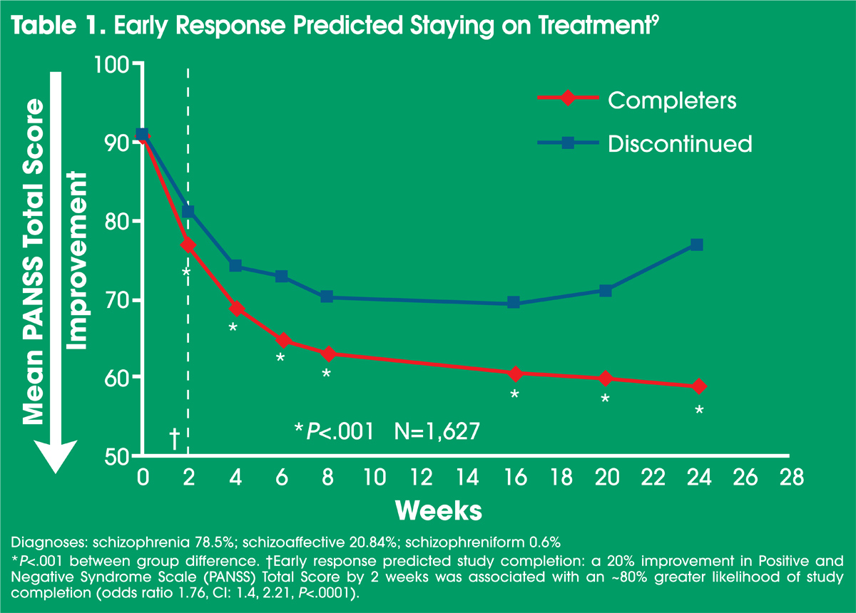 Evidence suggests that evaluating response after 2 weeks may be a valuable predictor of how patients will ultimately respond.8 This study’s response criterion was 20% improvement on the total Positive and Negative Syndrome Score (PANSS) at 2 weeks. There was a dramatic difference in response at 24 weeks between patients with ≥20% improvement and patients with <20% improvement at 2 weeks. The disparity in response was still fairly dramatic even after 24 weeks, suggesting that the early non-responders never catch up to the early responders.8 This may provide some valuable predictive information and has implications for how we prepare patients for maintenance treatment. That is, should we consider a change in treatment during early phase treatment for early non-responders in attempt to achieve a greater likelihood of remission at ~24 weeks?