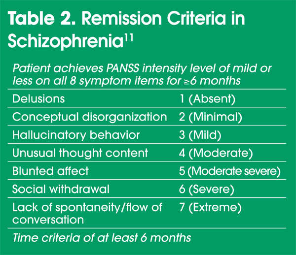We developed a set of criteria defining remission (Table 2). These criteria require that patients have no more than mild levels of several major symptoms associated with the diagnosis of schizophrenia.11 They also represent the treatment standard, in terms of acute treatment (ie, we want patients to achieve remission), and what we are trying to sustain in maintenance treatment. Patients must meet these criteria for a minimum of 6 months to be considered remitted, ie, no rating greater than mild on any of these 8 items for 6 continuous months.