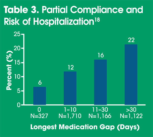 One of the major reasons for the significant rates16 of relapse and re-hospitalization is medication non-adherence.17,18 Other reasons include psychosocial stressors and substance abuse, but some patients relapse for reasons we do not understand. Adherence is poor across physical and psychiatric disorders, and particularly in persistent disorders, where treatments are designed to prevent symptom onset or recurrence, and the consequences of stopping treatment are delayed.19,20 A medication gap as short as 10 days can double the risk of re-hospitalization for schizophrenia, and there is a steady—nearly linear—increase of risk as the gap widens (Table 3).18,20