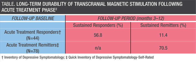 Using the same sample population as in the Carpenter study, Dunner and colleagues conducted a follow-up study to evaluate the long-term durability of TMS treatment effects following the acute treatment phase.2 The 52-week follow-up involved 257 patients who agreed to be followed and included assessments at 3, 6, 9, and 12 months, using several clinical measures to track symptoms.